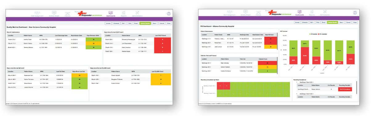 - Enterprise Dashboards & Insights – Real-time visibility across IT, clinical, quality, and financial metrics, including staff coverage, engagement, response times, patient activity, and protocol adherence.